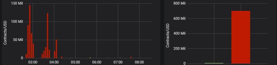 受这波跳水行情影响,Bitmex交易所在过去6小时时间里有近7亿美元多单爆仓,其中爆仓发生的时间点主要集中在行情启动跳水之初,其中北京时间今晨2:50至2:55这短短5分钟时间里就有价值超过1.45亿美元的多单遭到强平。