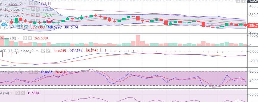 BCH上行触及布林带中轨受阻,形成回调,昨日给大家提到过300位置的阻力压制,而今日也是在300形成的下跌走势,最低跌至280位置,整体未能摆脱震荡的局面,现阶段走势还未触及有效的支撑地带,走势仍有进一步向下的姿态,看好短期支撑线280,打破后关注270位置。