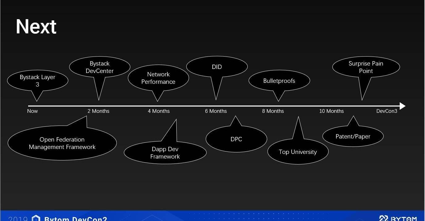 在平台建设方面,Bystack将开放BaaS平台,并推出开发者中心以及BystackDID。同时,Bystack将持续改善核心数据层和网络协议,推出BBFT共识2.0和迭代和Bytom1.2.0的升级,减少区块重组概率,改进极端情况下确认耗时问题,优化区块传播效率,减少工作量验证耗时。以及核心数据层和网络协议改进,达到更高压缩比,更低时延,更低带宽和更低存储的要求。