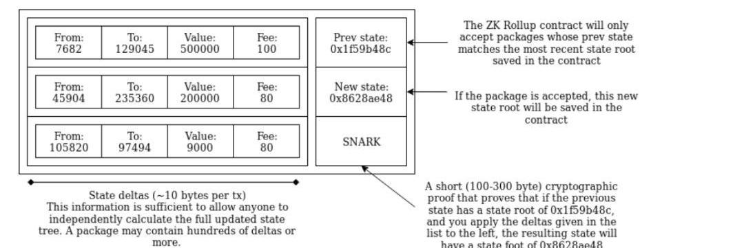 上图:发布在链上的ZKRollup包剖析图。影响ZKRollup系统状态的数百笔“内部交易”被压缩成一个包,其中包含约占10个字节大小的每笔内部交易,以及用于证明相关转移过程全部有效性的SNARK,约100-300字节。