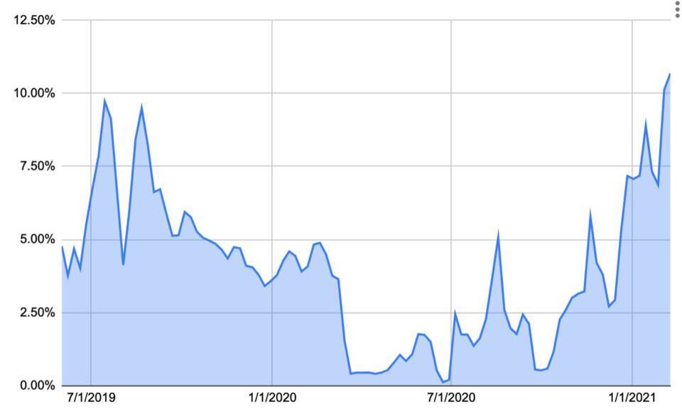 看一下 USDC 在 Compound 协议中的历史贷款利率,可以看到这些年来,贷款利率从 - 1% 一路飙升至 10% 以上。而这一协议中的智能合约风险没有发生任何实质的变化,这表明:高利率可能更多受到需求驱动而不是供应。