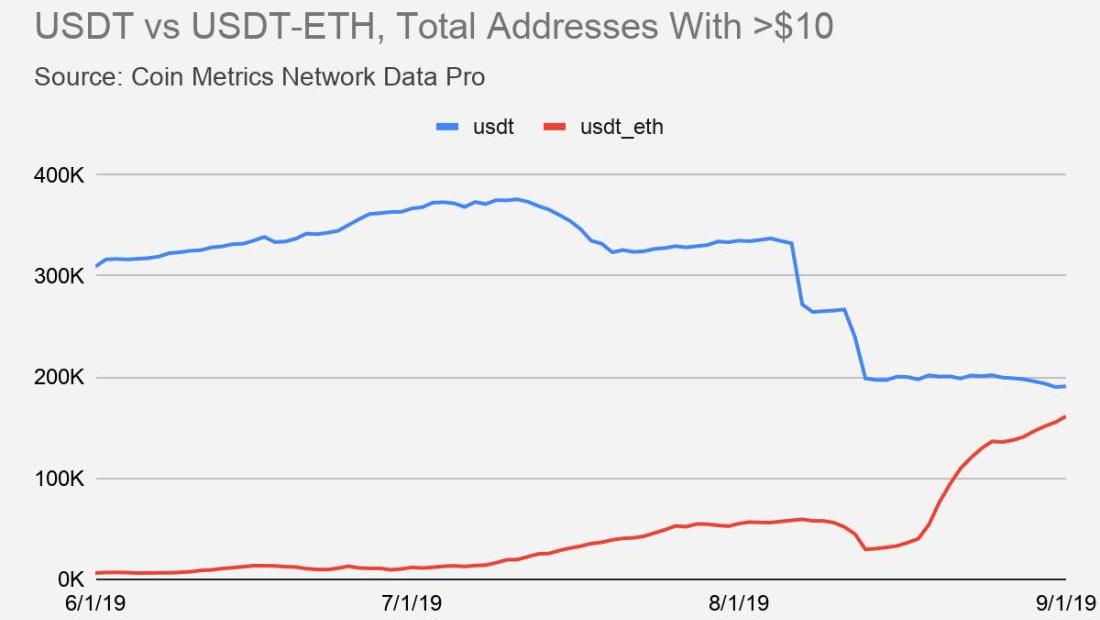 尽管Tether在过去三个月的增长率不如其它的稳定币,但就ERC20版本的USDT来看,其增长是很快速的。从USDT到USDT-ETH的转变,正在迅速地进行,根据趋势来看,在未来几个月内,USDT-ETH在多数主要指标上都会超过USDT。下表分别显示了价值超过10美元的USDT和USDT-ETH的地址总数情况。