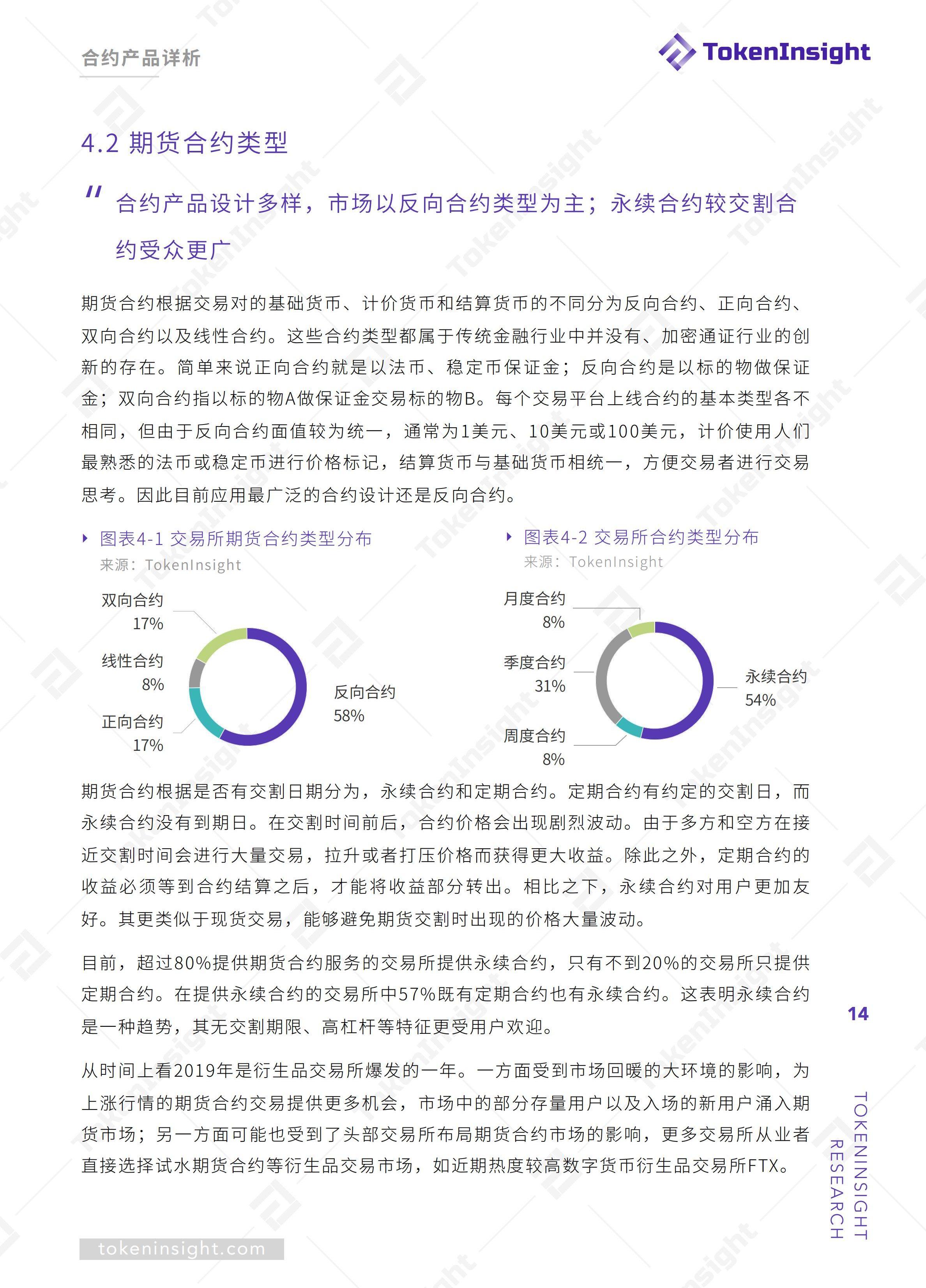 7.?2019年以来加密货币衍生品不断创新,出现期权合约、指数合约和杠杆代币等新型衍生品。期权合约已成为新的风向标,主流平台纷纷开始研发期权合约产品。目前市场上以反向合约为主,永续合约较交割合约更受欢迎,百倍杠杆设计已成常态。
