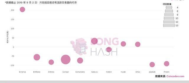 其中成绩最好的显然是币安,其四个项目的投资回报率中位数为203%。Gate.io,火币和OKEx都呈现了正投资回报率。另一方面,probit和p2pb2b的投资回报率中位数均低于-90%—对那些在这段时期内在这些项目里投入了100美元的投资者而言,能够拿到10美元离场已经算是幸运的了。