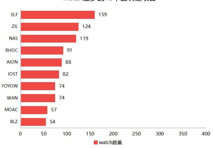 在50个项目中,ELF、ZIL、NAS、RHOC、AION、IOST、YOYOW、WAN、MOAC、BLZ所获得了watch最多。