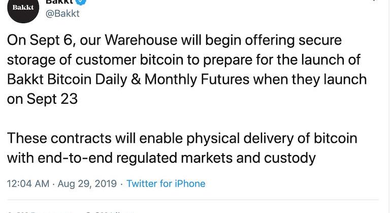 Bakkt在推特上表示,它将开始为客户提供比特币的安全存储,“为9月23日推出”的每日和月度比特币期货合约做准备。