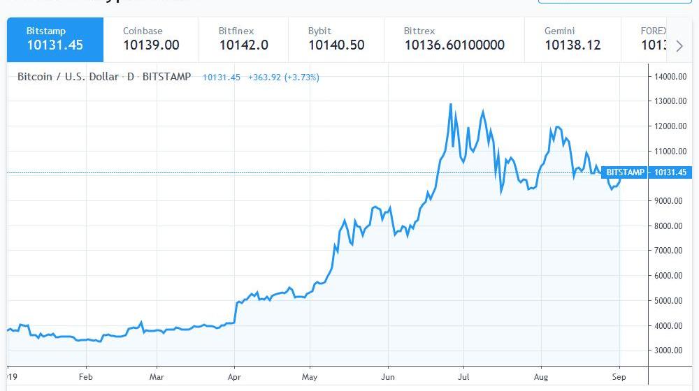 比特币在周一(2019年9月2日)的几个小时内上涨了5%以上。自上周三(2019年8月28日)比特币价格跌破1万美元以来,比特币价格首次突破1万美元。