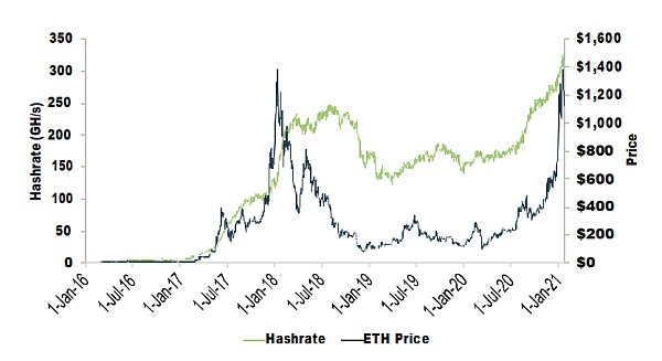 我们可以将以太坊网络上收取的每日交易费用总额作为衡量需求的标准,如下图所示。由于ETH是用来支付这些费用的商品,高交易费推高对ETH的需求,好比旅游热会推高对汽油的需求。值得注意的是,2021年一月的总交易费用差不多达到2018年一月高峰期交易费用的5倍。而ETH的价格也几乎接近于2018年的峰值。