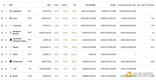 在市值排名前20的加密市场中,DeFi系占据了5个席位,分别是chainlink(第8位)、Aave(第14位)、Uniswap(第15位)、Wbtc(第16位)、SNX(第20位),包括BCH、BSV等老牌项目目前已跌出市值前十。