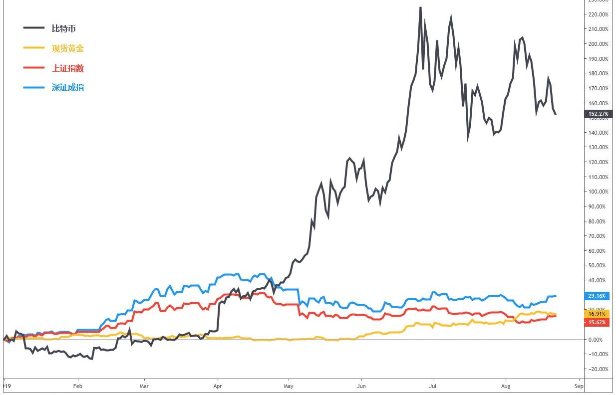不过回溯今年上半年的市场表现,当下受关注度较高的投资标的竞争,看似已经走成了一场毫无悬念的“比赛”。真正领跑市场的“霸主级”投资标的,就是仍然备受争议的比特币。虽然在最近两个月内多有波折,且确实也在最近一段时间里出现了强度可观的价格回调,但是截止发文时段,比特币在今年年初以来仍然保有超150%的惊人涨幅,远远甩开了A股两大股指,而一直被视作是比特币“追赶目标”的黄金一直不已高波动性著称,显然也并无法撼动比特币上半年的领涨地位。