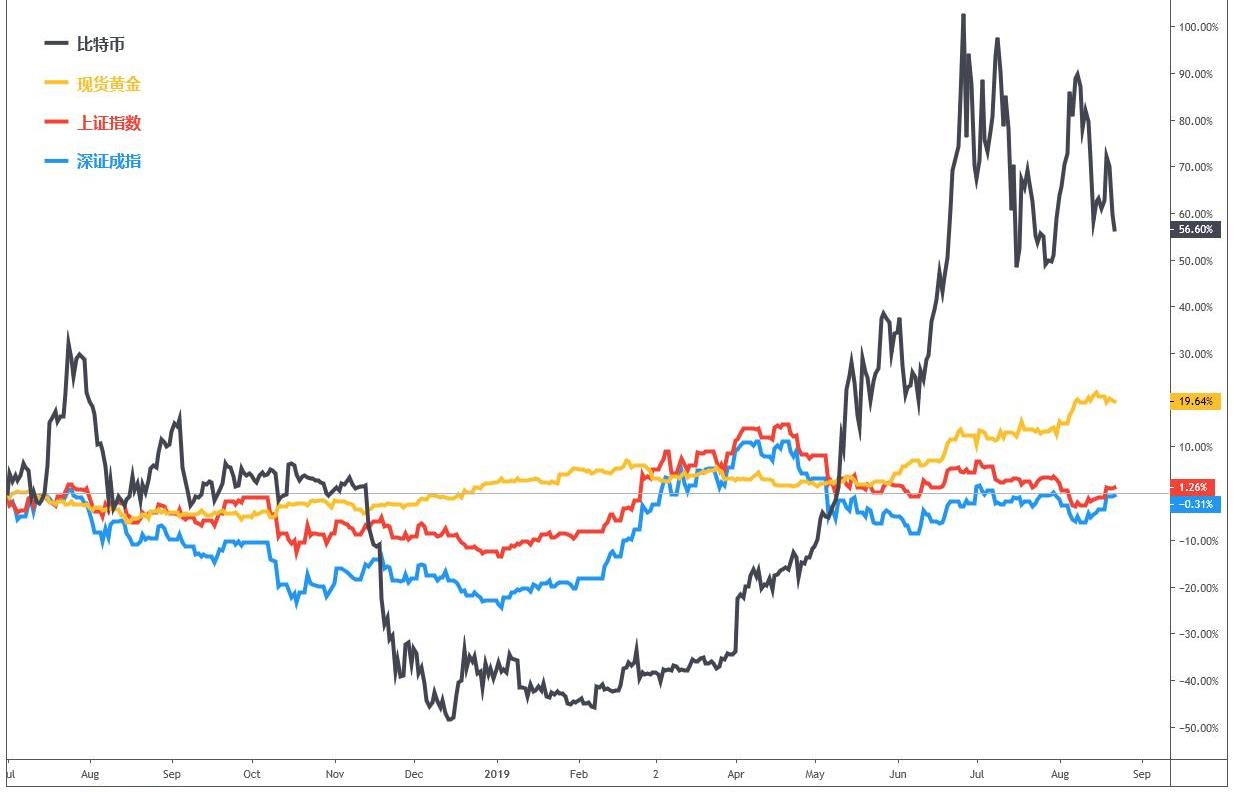 如若读者因为上图中时间段的选取恰好与比特币小牛市相匹配存在疑问,那么我们可以把观察的样本区间进一步扩大,增加比特币出现历史级熊市的2018年下半年表现,我们能够发现,比特币仍然可以在这个时间跨度超一年的阶段中远远甩开其他“竞争对手”。
