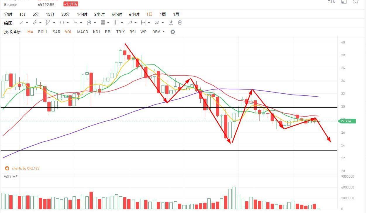 BNB维持昨天的观点,短暂震荡过后还是要向下,我们不否认该标的的长期价值,但是接下来一段时间的走势我们是不看好的,最多也就是再度反抽60天线,还将继续向下运行,均线系统保持空头排列,macd指标在弱势区域反复再次金叉之后粘合,无发散方向,该指标要到零轴之上才有较强的指向意义,该标的重新站回60天线并且使得60天线拐头向上才能摆脱目前的下降趋势,个人认为24美元的低点不能有效支撑,还会继续下探,下一支撑位在21美元附近,注意风险。