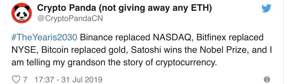 “时间来到2030年。币安替代了纳斯达克,Bitfinex替代了纽约证交所,比特币替代了黄金,中本聪获得了诺贝尔奖,而我则在向我们孙子讲述加密货币的故事。”