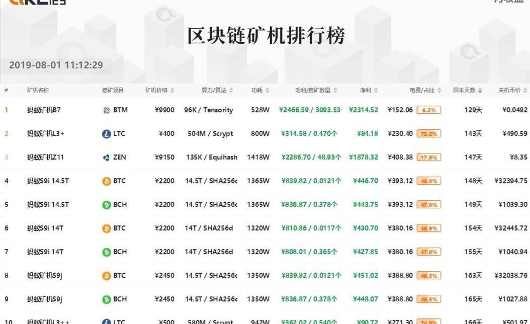 按照08月01日当日的Token价格和默认算力、电费等指标来计算,用来挖取BTM项目Token的蚂蚁矿机B7回本天数最短,预期回本天数为152.06天,其预期月净利高达2314.52元,远高于其他项目。其次是蚂蚁矿机L3+,该矿机可专门用来挖取LTC项目Token,但其预期月净利仅为84.18元,明显低于多数区块链矿机。用来挖取ZEN项目Token的蚂蚁矿机Z11位列第三,其预期月净利高达1878.32元,远高于前两者。