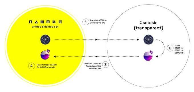 第二类是类似Cosmos里面Namada的设计,叫做多资产屏蔽池,多个隐私保护的资产共享一个匿名集,再配合上IBC强大的互操作性,至少在Cosmos生态内部,理论上可以提供Cosmos链上主流所有资产的屏蔽保护,比如你想要私密的交换Osmo和Atom,就可以类似下面这种图的实现方式。