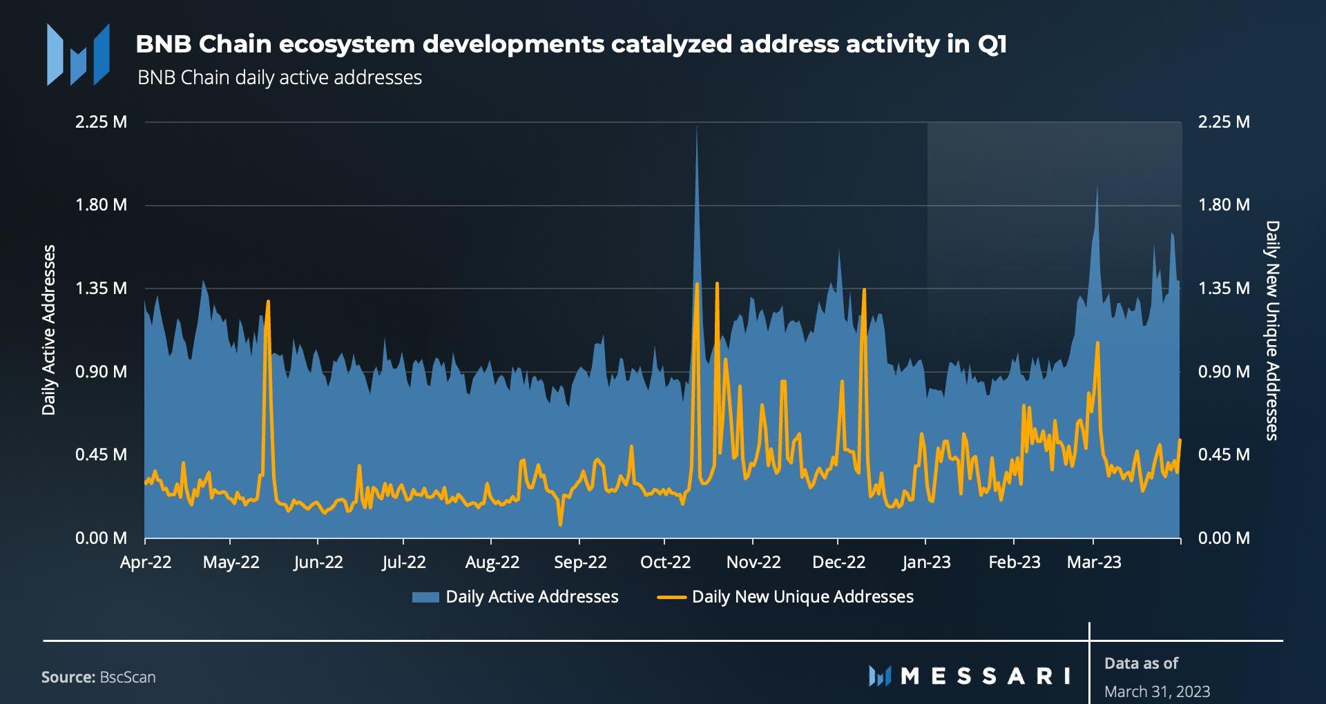 在经历了动荡的2022年之后,加密市场在1月份反弹,并在本季度末展现出韧性。因此,随着网络活动的上升趋势,BNBChain的财务业绩有所改善。平均交易费用下降,收入减少;同时,流通市值环比增长24.9%。