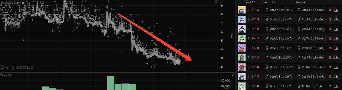 5、情况变得糟糕透了,也许只是几十个nft不断的在这样循环和买卖倒手,就使得一个整个项目团队用了一两年时间苦心运营的蓝筹nft项目,在短短1个月时间从六七个eth被砸到两三个eth,在这个过程中,只有庄家能赚到几十上百个ETH,大部分参与者都会因为割肉产生亏损,更糟糕的是,这个过程庄家赚到的eth也非常有限,但是却导致整个nft项目的市值可能蒸发掉几千甚至几万个eth。这时一个多输的局面产生了。