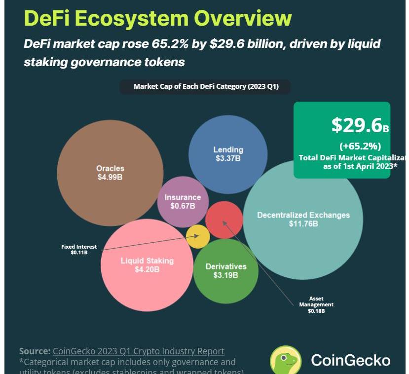 2023年第一季度,去中心化金融领域的市值大涨65.2%,相当于增长了296亿美元,这主要是受流动性质押治理代币表现的推动。