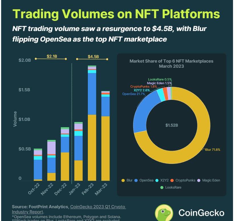 非同质化代币交易量大幅增加,从2022年第四季度的21亿美元上涨了68%至2023年第一季度的45亿美元。