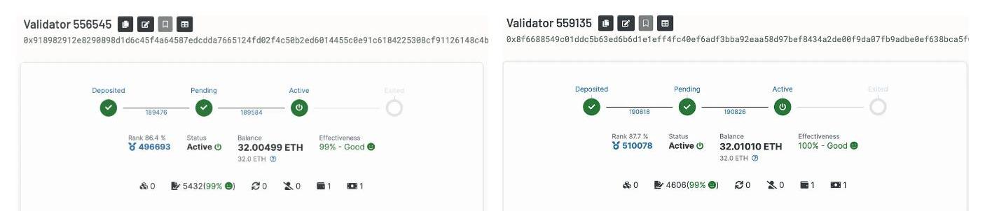 我们的两个DV现在都在主网上运行——你可以在此处查看验证器556545和验证器559135。虽然他们还没有出块,但分别保持99%和100%效率。感谢Obol团队和他们简化的仪表板,我们可以非常轻松地完成此过程。期待看到Obol接下来会发生什么!