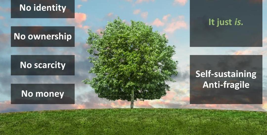 在更高的层面上,我们还可以看到一些群体形态。它们没有身份、所有权、稀缺性或货币——它们只是存在着。它们是自给自足、反脆弱的。