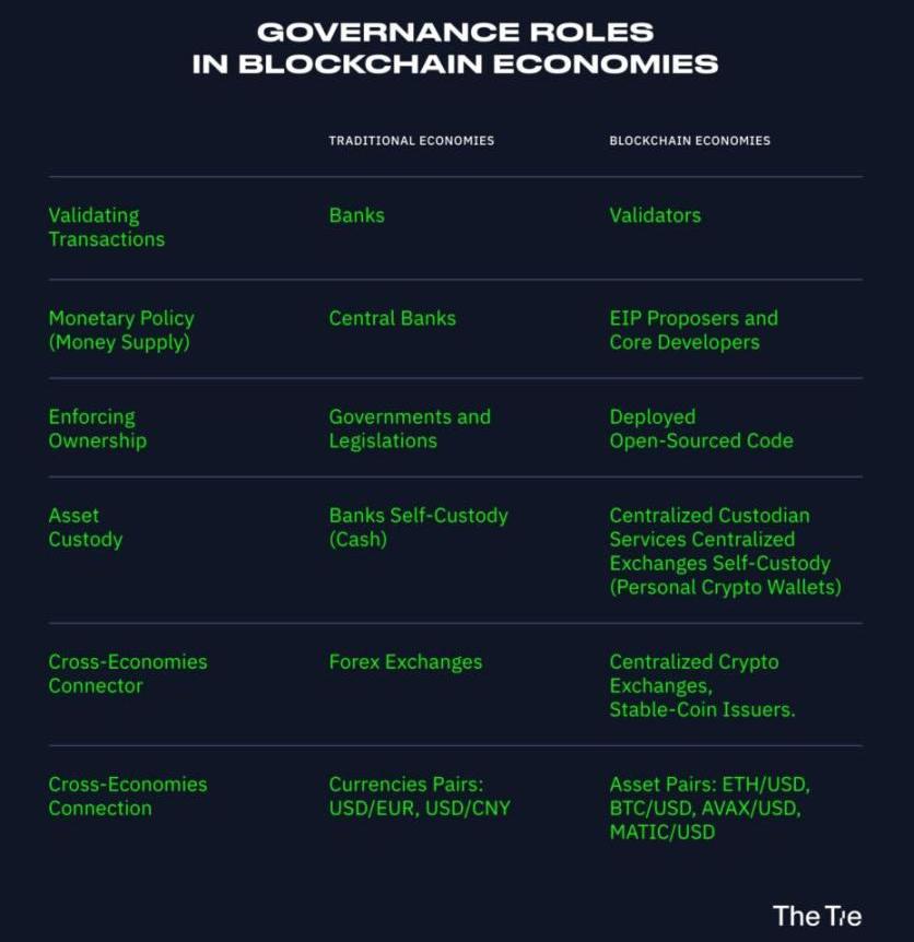 除了交易权和影响货币政策变化的权力外,还有在发生冲突时强制执行的权力。在传统经济中,银行和美联储都不影响所有权,但政府和立法会这样做。而在区块链平台上,代码管理这些事务。一旦验证者确认交易进入余额,开源代码就是法律,它通过公共分类账公开和透明地规范和管理链上的所有权。