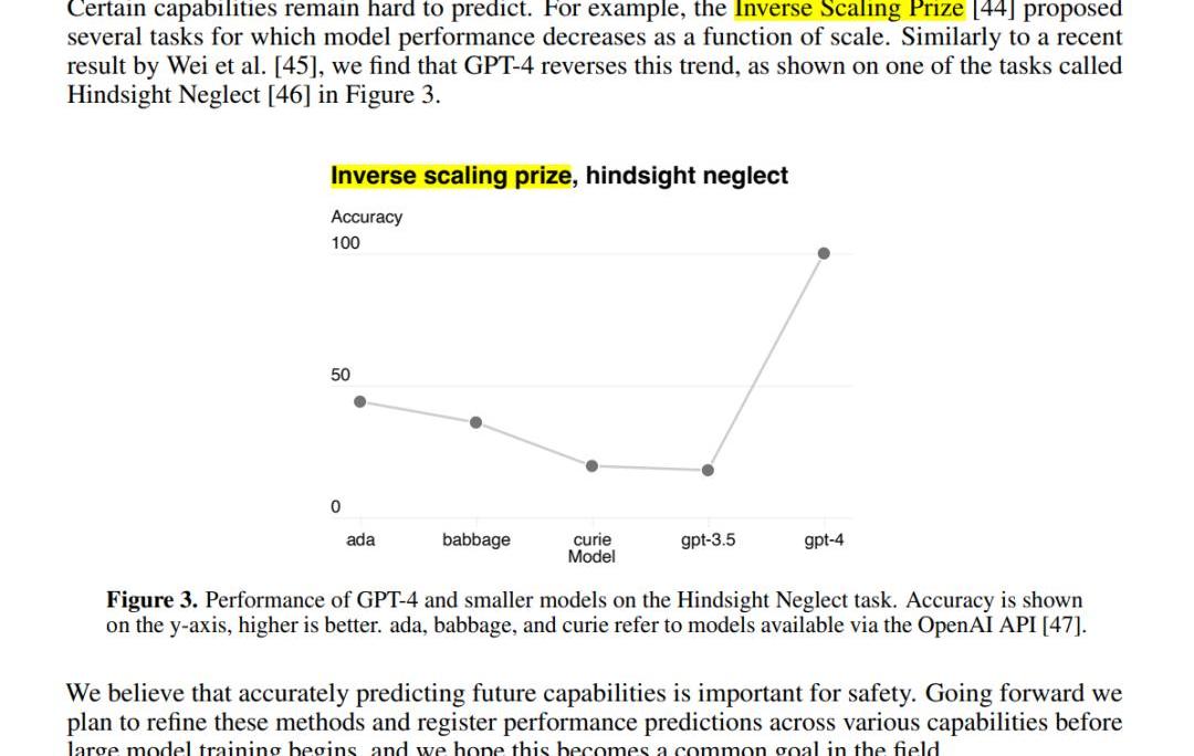 第一,多模态处理能力:GPT-4可以接受包含文本和图片的输入,并生成包括自然语言和代码在内的文本输出。这使得它在处理文档、图表或屏幕截图等任务时表现出色。第二,更好的性能和表现:相比前代GPT-3.5,在处理复杂任务时表现更为出色,在各大面向人类的考试中展示出了更高的准确性、可靠性、创造力和理解能力。第三,Test-TimeTechniques扩展能力:GPT-4使用了Test-TimeTechniques如few-shot和chain-of-thoughtprompting进一步扩展了其能力,使其能够更好地处理新领域和任务。第四,安全性优化:GPT-4重视安全性,生成回复的正确性得到了重点优化。它还进行了对抗性真实性评估,以避免潜在的安全隐患。第五,开源框架支持:OpenAI开源了用于评价大语言模型的开源框架OpenAIEvals,可以帮助研究人员和开发者评估他们的模型,并提供更好的指导。第六,模型训练和监控:OpenAI强调对模型进行评估和监控的重要性,以避免潜在的安全隐患。GPT-4也已被应用在了OpenAI内部,例如内容生成、销售和编程,并在模型训练的第二阶段负责输出评估、对齐工作。这里我们也抛一个问题:(究竟如何定义“模型的性能?”模型越来越难评估了,比如说,市场认为的某些某些不如chatgpt,但是也有人测试觉得更好,是怎么定量的评估呢?)3.Reverseinversescalingprize:一些随着模型变大性能下降的任务,在GPT-4上不再出现类似现象如何理解reverseinversescalingprize?通过阅读论文原文,InverseScalingPrize提出的几个任务,模型性能会随着scale的扩大而下降,但是我们发现GPT-4扭转了这一趋势。也就是说,GPT-4scale扩大,性能也不会下降。见下图: