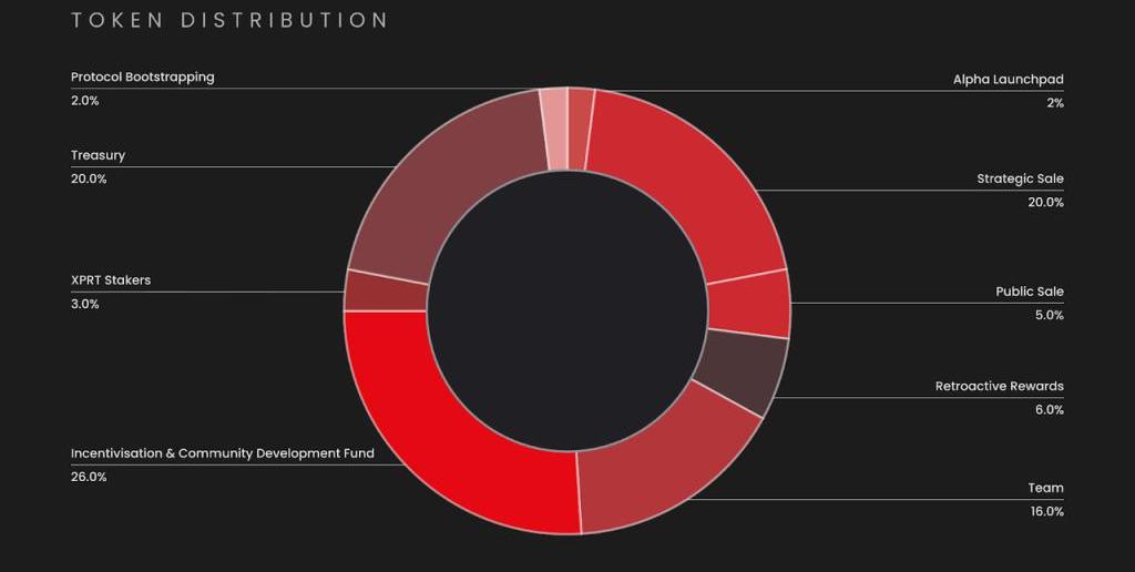 2%属于AlphaLaunchpad,分配给AlphaFinance的质押用户和AlphaFinance团队;20%是战略出售,在投资后6个月开始解锁,随后的12个月内线性解锁;5%是在CoinList上的公开募集,其中的25%在出售当天解锁,剩余的在6个月内线性解锁;6%是追溯奖励,提供给stkATOM-ETH和stkXPRT-ETH池的流动性提供者。6个月内线性解锁完毕;16%归属于团队,在代币开启二级市场流通之后18个月后开始解锁,在随后的18个月内完成线性解锁;26%属于激励和社区发展基金:每个季度线性解锁,并在2年内全部解锁;3%属于XPRT质押者,在1年内按季度线性解锁;20%属于国库,代币开启二级市场流通之后24个月内线性解锁;2%属于项目的bootstrapping,在代币上线后即可流通。