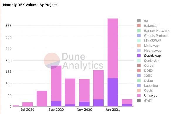 无论如何,尽管缺乏额外的激励措施,较高的流动性是产品及其市场地位的有力指标。UniSwap仍然是交易者和Token项目的领先交易平台。然而,SushiSwap在1月底突破了20亿美元大关,进一步凸显了自身的健康发展。