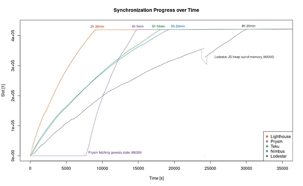 在上表中,通过比较客户端同步相同的 slot 需要花多少时间来比较其同步进程。在评选结果之前 (虽然这不是本文的讨论范围),关于该图表我们需要知道三件事。