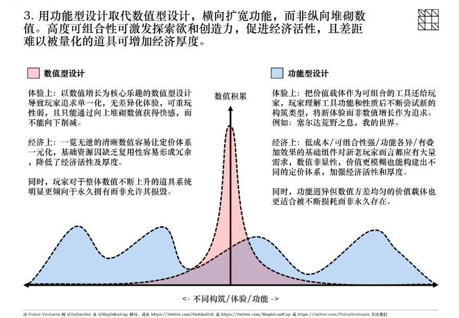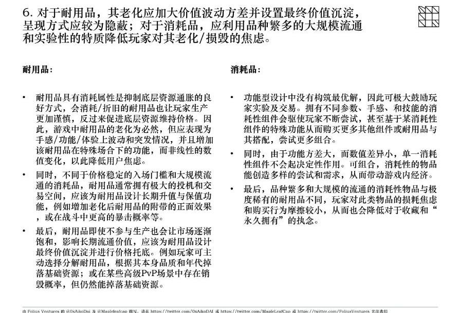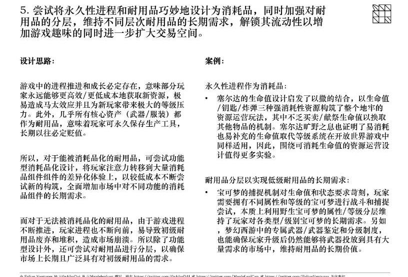 该设计的意义在于,通过尝试将耐用品巧妙地设计为消耗品,同时加强对耐用品的分层,可维持不同层次耐用品的长期需求,继续延伸的话还可以通过解锁其流动性,在增加游戏趣味的同时进一步扩大交易空间。