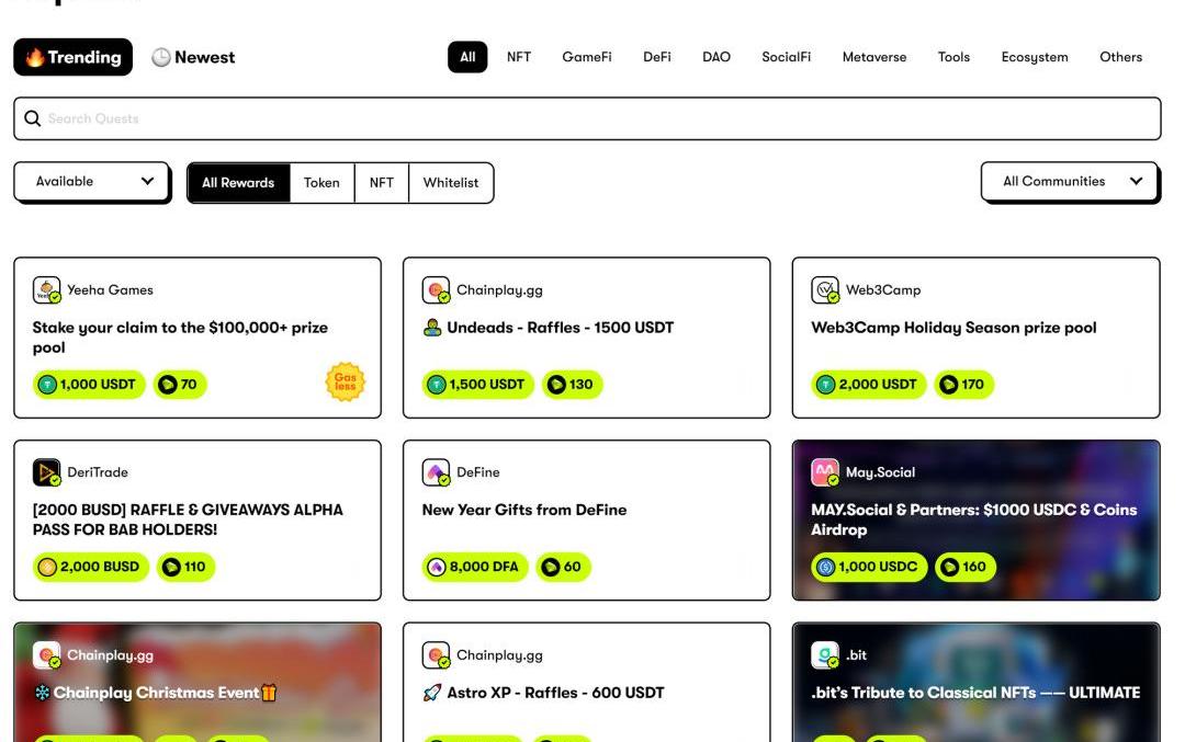 Crew3.xyz是一个侧重于对社区进行宣传的平台,主要目标是帮助web3社区不断成长;增加Web3项目的社区成员参与度;将社区成员转变为贡献者。Web3用户和参与者可通过完成任务而获得奖励。Quest3上提供的任务基本都是特定项目任务,用户通过关注项目方推特,转推,加入Discord,注册项目账号,项目知识答题等任务。任务多为项目方营销获客设计,因此,将其定义为toB模式。