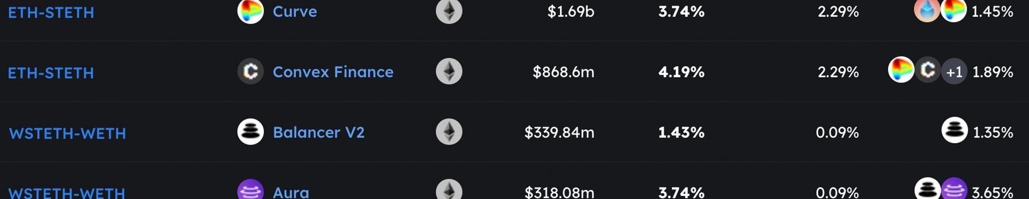 举个例子:用户通过Lido存入ETH获得协议生成的流动质押凭证stETH,此时可以直接切换至Curve协议,为ETH/stETHLP池提供流动性获得Defi收益。同理,也可以切换至Convex/Balancer等Defi协议提供流动性。