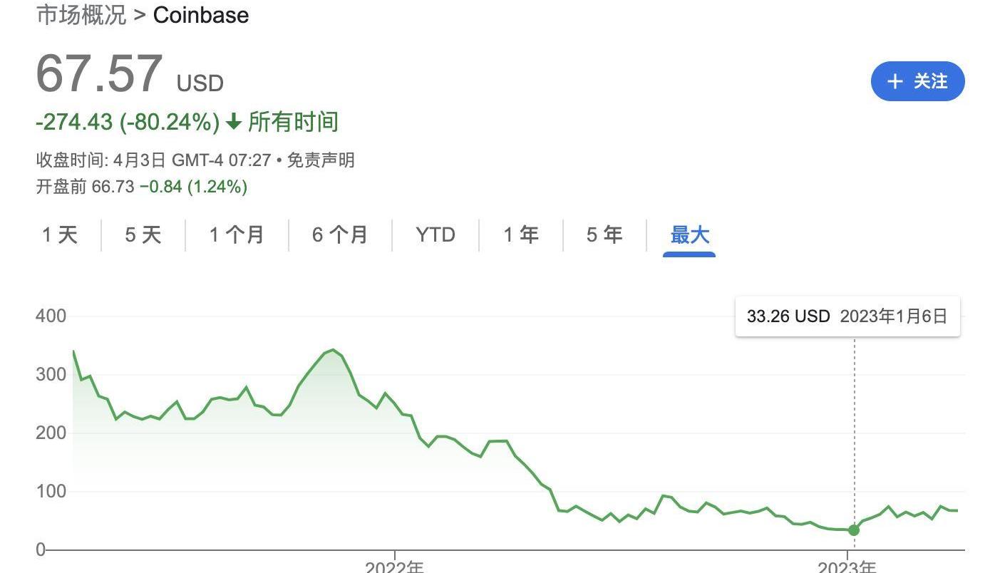 众所周知,Coinbase上市出道即巅峰,此后数年,其业绩惨淡、负面消息缠身以至于股价跌跌不休。而自今年初以来,它终于迎来触底反弹。伴随加密市场的回暖,其股价已经从30+美元低位上涨一倍有余。