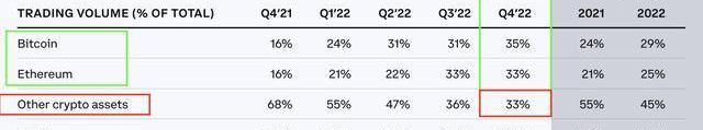 上表反映了Coinbase平台不同资产类别的交易量占比情况,比特币、ETH和其他,其他中包括一些所谓“山寨币”。