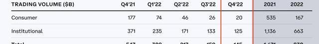 上表是Coinbase两类交易者所贡献的交易量占比情况。拆解来看,零售交易量从2021Q4的1770亿美元下降至2022Q4的200亿美元;虽然机构交易量也在下降,从2021Q4的3710亿美元下降至2022Q4的1250亿美元,然而其占比却从68%上升到86%。