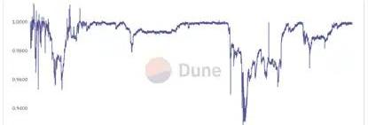 图5.以太坊质押占比情况stETH是目前流动性最好的LSD代币,由下图的stETH/ETH价格曲线可以看出,stETH/ETH的价格在2021年3月和2022年6月期间出现了大规模的折价,分别对应3AC和FTX事件。这主要原因是流动性不足导致的。2021年的这部分卖出,时间点刚好也是大盘的高点,这部分卖出用户大多为2020年底的抵押用户,在此退出获利较多。