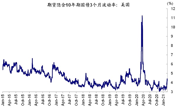 那么,隔夜债券利率的波动有多快呢?如果以1.61%的高点计,10年国债的波动率已经接近过去一年的2倍标准差,已经高于我们利率上行信号1.5倍标准差的“警戒水平”,2018年初最高接近2.5倍。一般而言,从历史经验看,高于这一阈值警戒水平通常会对市场带来扰动。在此背景下,债券期货隐含的波动率也升至疫情以来的高点。