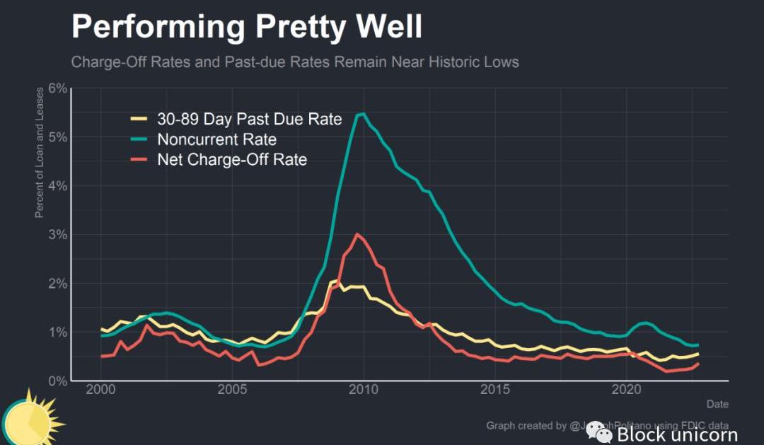 人们最担心的是金融崩溃会传染,即跨机构的联系、普遍的恐惧或周期性宏观经济因素可能会导致更多银行或其他机构陷入困境,并在经济中形成更广泛的恶性循环。到目前为止,与2008年危机蔓延相比,信贷风险仍是一个不同之处。从广义上讲,贷款冲销率和逾期利率仍处于或接近长期低点,尽管最近有上升趋势。换句话说,银行资产违约率还没有大幅上升。