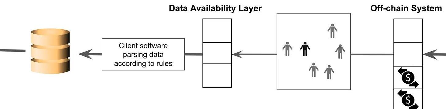 图:用户将把他们的交易发布到数据可用性层,客户端软件根据全球范围商定的规则集解析这些数据,以计算链外数据库。