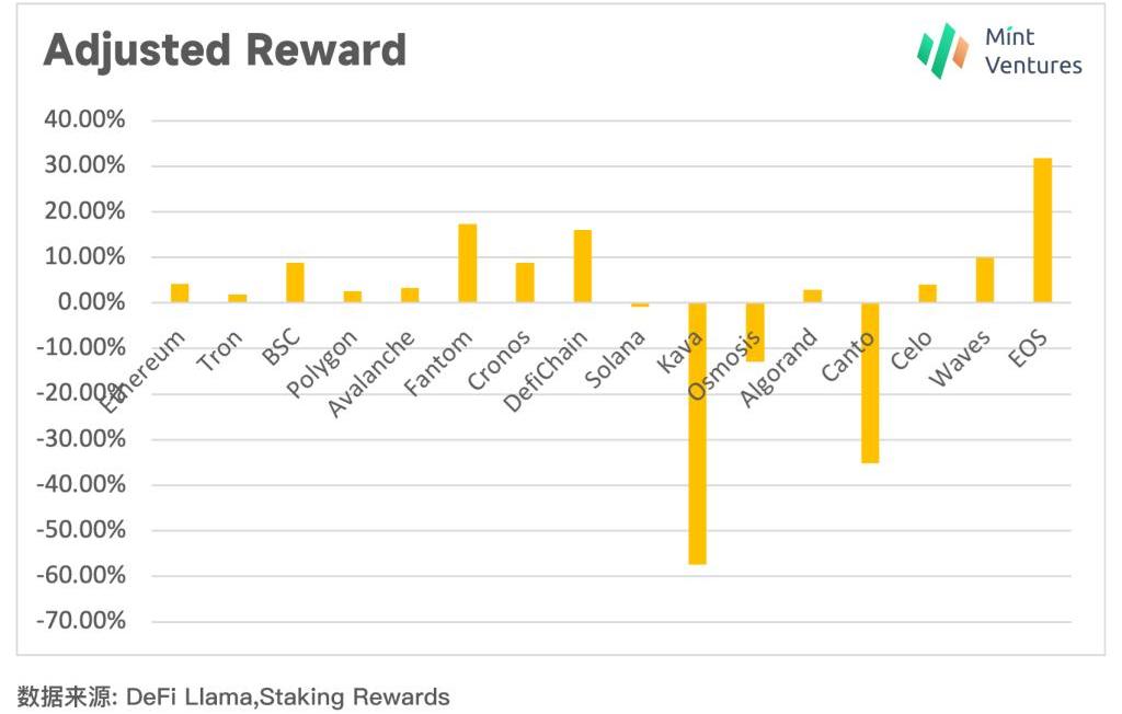 StakingRewards给出了调整后奖励收益率,通过调整网络供应造成的通胀计算得出。adjustedreward可以用来代表实际利率。从下图可以看到,大部分公链项目仍然处于增长态势中。