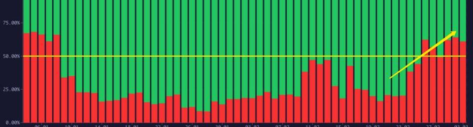 根据GMX数据,今年1月以来多头持续开仓,持仓占比最高超过90%,显示出一致的看涨预期。当价格处于底部,市场参与者逐渐加入多头阵营时,往往是上涨趋势的开始;当价格上涨延续一段时间,几乎所有市场参与者都在做多,却迟迟不能突破压力位时,则应警惕潜在的回调风险。BTC多次突破25300一带失败后,多头持仓由1.6亿美元下降至6000万美元,空头持仓由4000万美元上升至9000万美元,空头持仓近期首次超过50%。当狂热的多头缴械投降后,"多杀多"的快速下行风险已大幅降低。