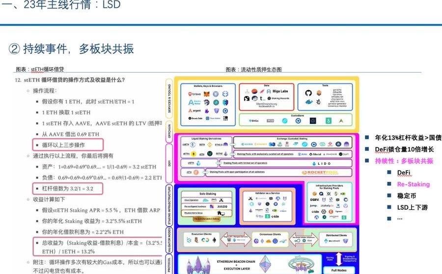 背景:不可否认LSD是2023年上半年,甚至整年最主流的叙事当前以太坊的质押率只有14.6%,FraxFinance后,DeFi套娃式的风潮正在愈演愈烈,当下LSD协议为了争夺用户和资金,不仅要提供流动性,而且还要有更高收益率,所以套娃模型和“乐高飞轮”应运而生。