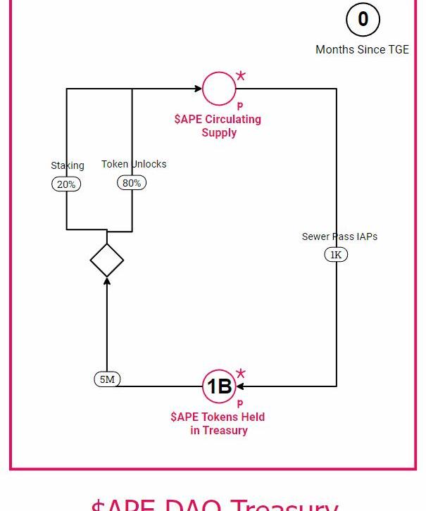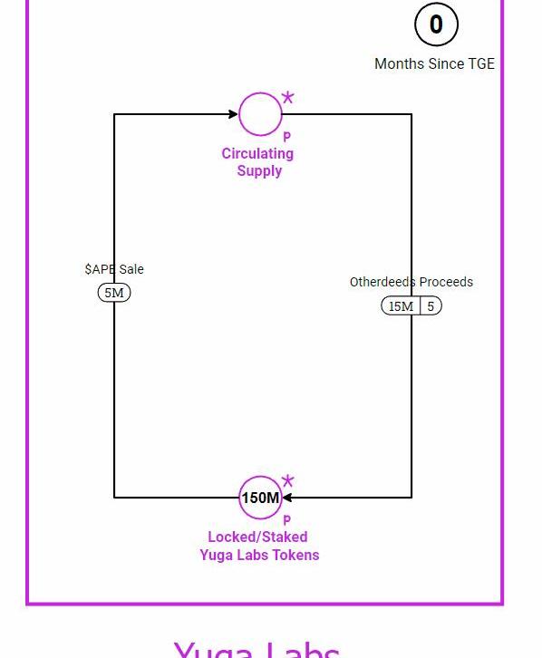 在这个假设的图表中,我们可以观察到几个事件正在发生。每个月,500万个APE代币通过预定的代币解锁和质押奖励进入流通。此外,我们可以看到每个月有1,000个APE代币通过在Yuga的手机游戏中出售SewerPassIAPs被转移回到$APE储备库中。