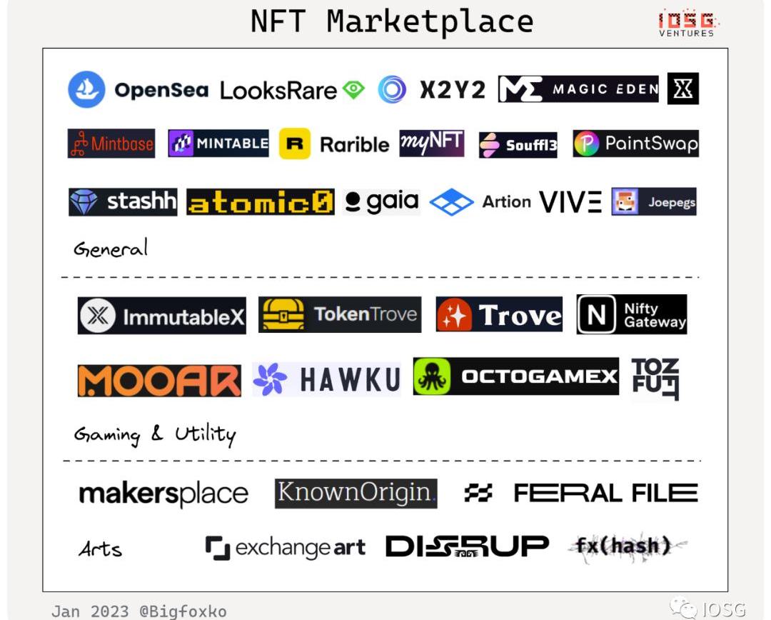直接交易层(52个项目)对于NFT交易市场(Marketplace),我们主要基于其功能将分为三类:以OpenSea、LooksRare、X2Y2等为代表的,分布在不同链上的全品类NFT综合交易市场(GeneralMarketplace)以Trove、NiftyGateway等为代表的游戏等实用类NFT垂直交易市场以KnowOrigin、makersplace等为代表的艺术类NFT垂直交易市场