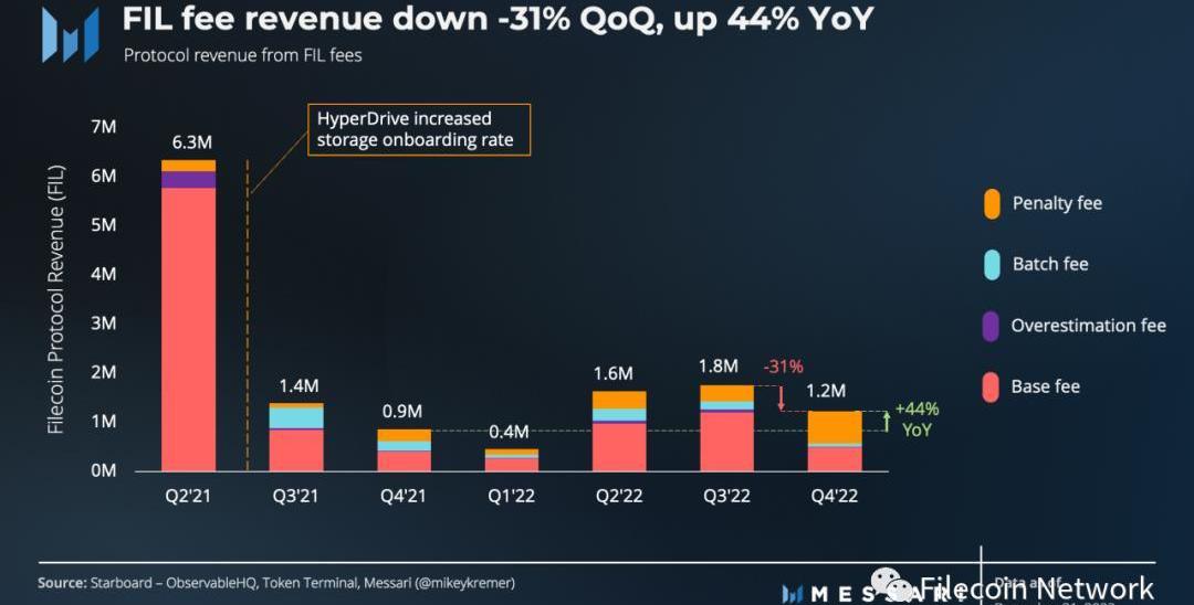 22年第四季度我们能持续看到FIL协议收入相对较低。通过聚合存储证明,HyperDrive让存储新增速率有了10-25倍的提升。虽然这个升级让网络参与者受益,但它也带来了整体交易费用的降低。因此,在过去四个季度,这个升级让协议收入降低了。