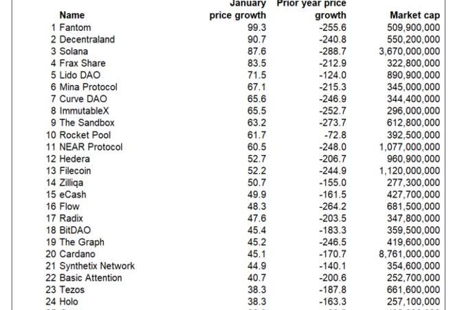 下图显示了2023年1月,市值超2.5亿美元代币与去年同期涨幅。研究图表并得出你自己的结论。