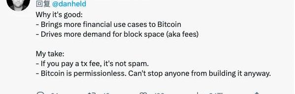 而支持者则认为,比特币NFT的兴起,是在传统的价值存储之外找到了新的应用场景,为比特币提供了更多的玩法和金融用例。前?Kraken?高管、比特币多头?DanHeld?表示,NFT的兴起将推动对区块空间的需求,从而提高费用——只要你支付了交易费用,那就不是垃圾信息。