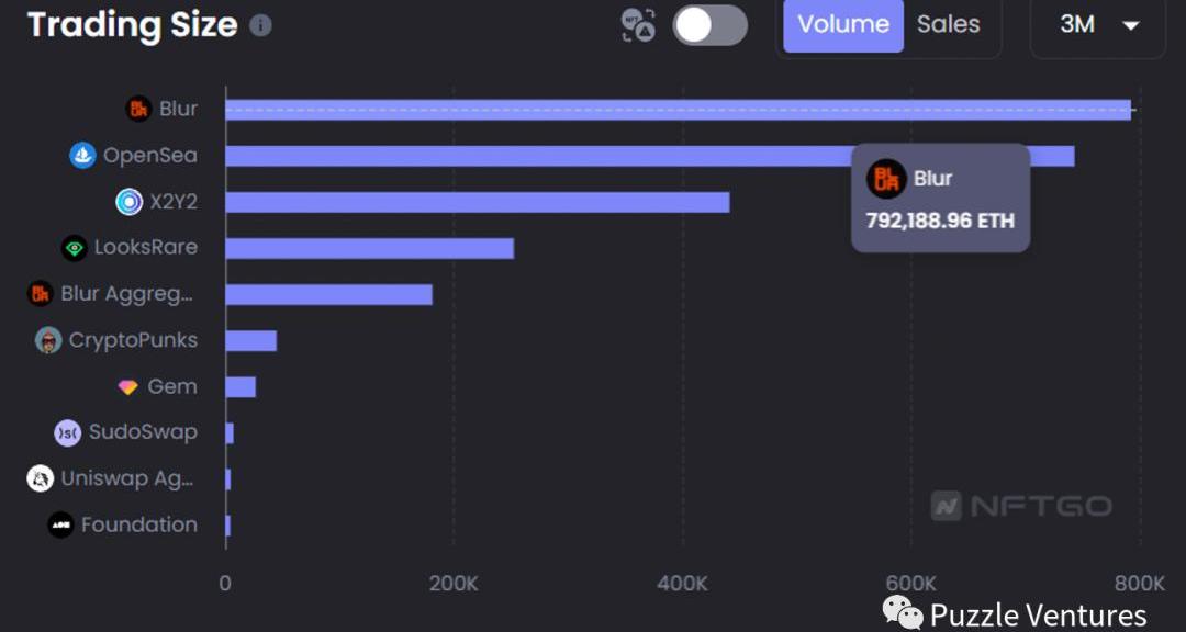 如果看?下最近3个?的NFT交易量市场流量排名,不难发现Blur的总交易量超过了OpenSea,?乎所有的NFT项?的地板都挂在Blur上。