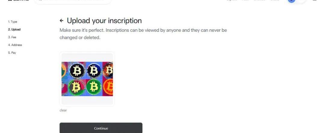要在Gamma进行操作,只需在你的BTC进入你的Xverse钱包后,前往这个网站。然后点击页面顶部的「Ordinals」按钮,选择「CreateInscription」。这样做将把你带到一个如下图所示的上传仪表板: